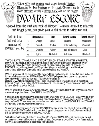"When VIPs and tourists need to get through Mother Mountain for their business or for sport; They’re sure to make offerings or pay a pretty purse out for the mighty DWARF ESCORT"